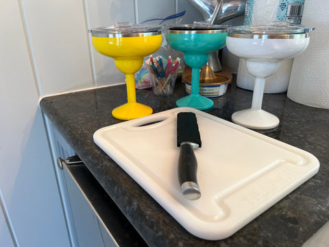 Upgrade your kitchen prep with the TRAPSKI HDPE Cutting Boards – built for serious cooks who demand durability, safety, and easy maintenance. Made from high-density polyethylene, our cutting board is knife-friendly, stain-resistant, and fully dishwasher safe. The non-porous surface prevents bacteria buildup while the built-in juice grooves help keep your counters clean. Available in professional Natural white and white blue accented trim, it's the perfect fit for your home kitchen, outdoor prep area, or commercial kitchen, boat, RV, camping or cabin get-away.