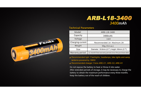 The ARB-L18-3400mAh rechargeable 18650 battery has built-in features to prevent short circuits and multiple layers of protection within it. With the new button-top design, the new 18650 series better accommodates a variety of flashlight brands. 18650 batteries are perfect for powerful Fenix LED flashlights since they are rechargeable, have a long battery life, and can handle the power requirements of advanced LED flashlights. Fenix 18650 batteries are rated for up to 500 charge cycles for impressive overall battery lifespan.