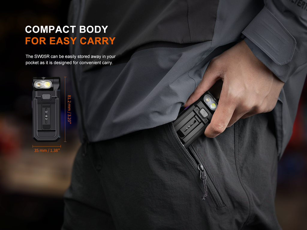 The Fenix SW05R is a versatile and compact flashlight designed for ultimate convenience and reliability. There are two variants and two colors for each variant. One variant features a white light plus a red light. The other variant features a white light plus a UV light.