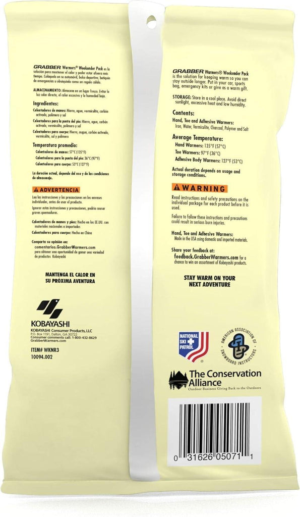 Stay warm on your next outdoor adventure with the Grabber® Weekender Pack! Each pack contains two Hand Warmers, two Toe Warmers and two Peel ‘N Stick Body Warmers. Great for home, car, work or to give as a warm gift. Grabber warmers are odorless and long-lasting sources of personal heat.