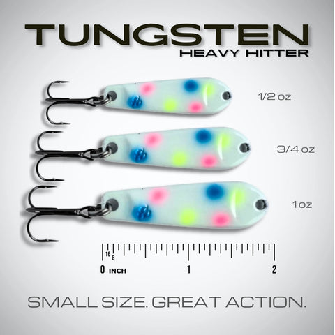 The Fish Bum Heavy Hitter Tungsten Jigging Spoon for walleye, whitefish, cisco, perch, lake trout, and more is built for anglers chasing results in ice or open water. Made from high-density tungsten, this fast-sinking vertical jigging spoon delivers a smaller profile and tighter flutter than lead—perfect when fish key in on smaller bait or subtle presentations. It drops faster, shows up stronger on forward-facing sonar (FFS), and triggers reaction bites from pressured fish. The Heavy Hitter excels for deep-water jigging, casting, and vertical presentations where sensitivity and control matter most. UV, Metallic, and Bright Glow finishes pop in low-light or stained water, throwing intense flash to call fish in from distance. This premium tungsten fishing lure features a compact baitfish profile, realistic action, and maximum flash and vibration. Built by anglers, for anglers — Fish Bum quality and proven performance make the Heavy Hitter one of the best tungsten jigging spoons on the market.