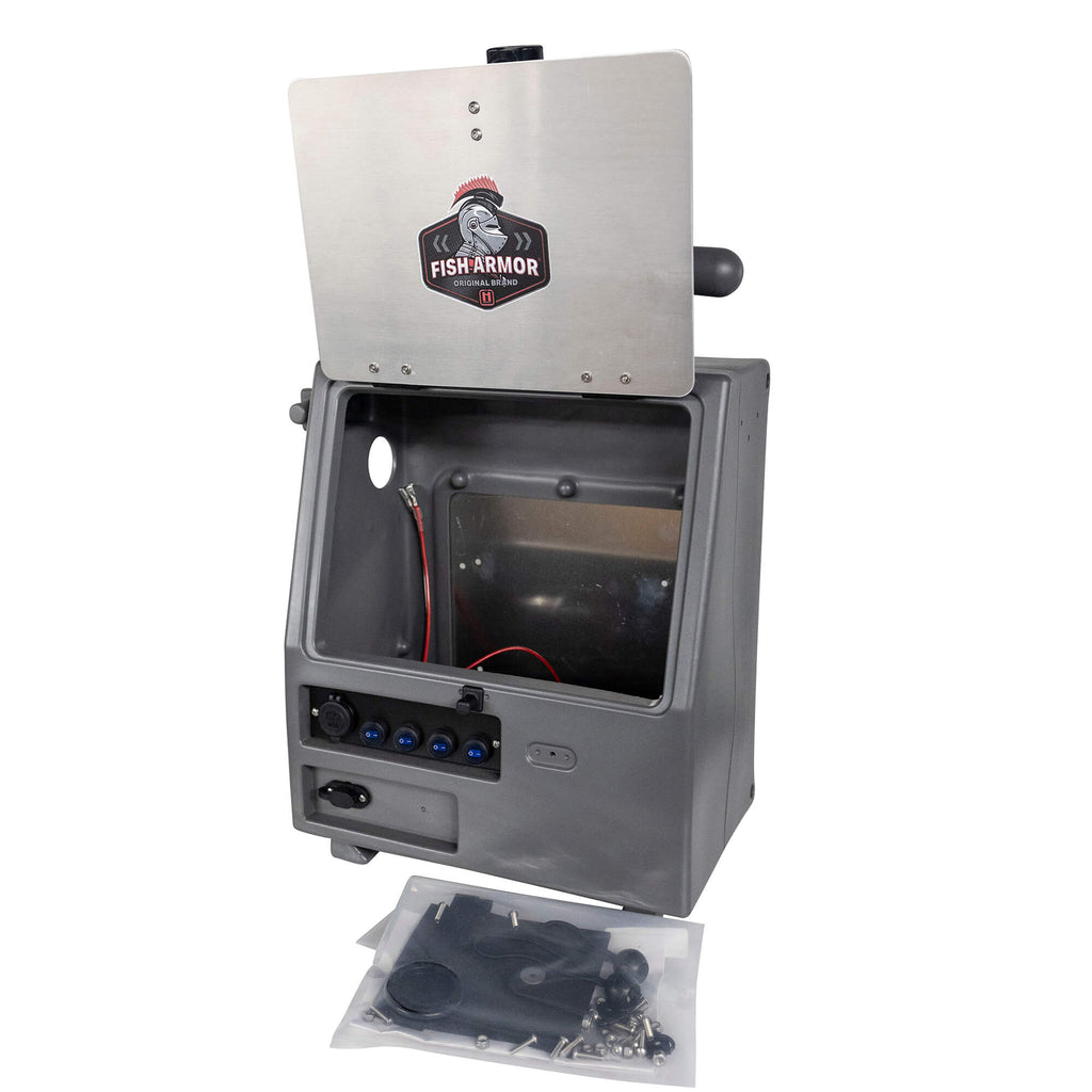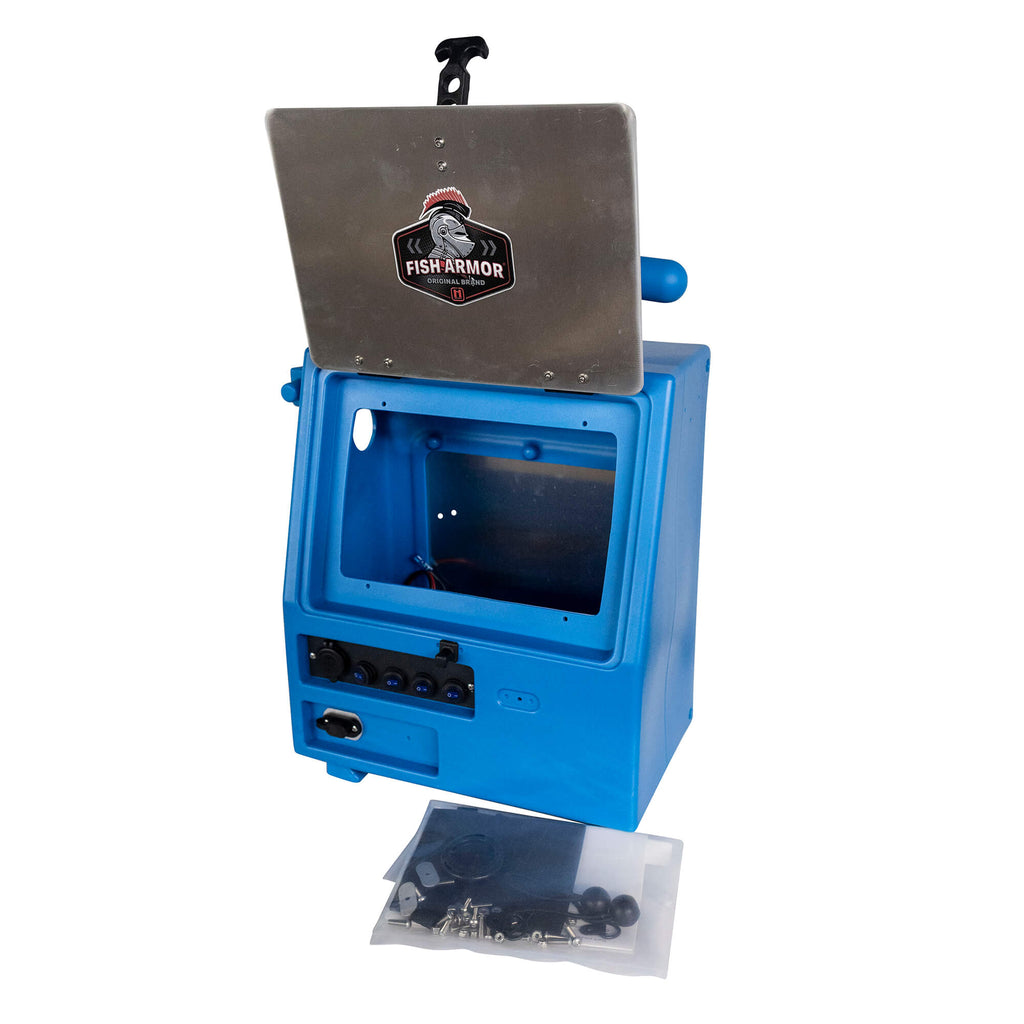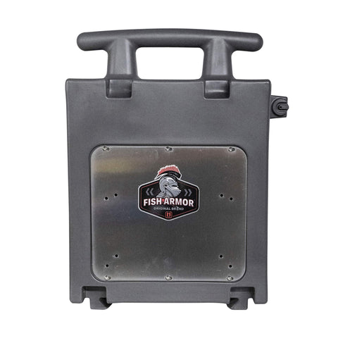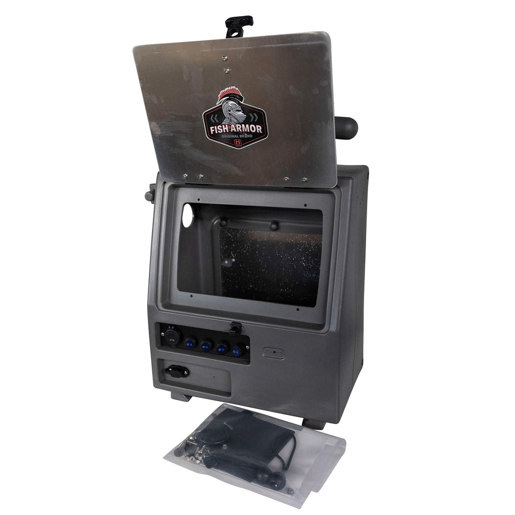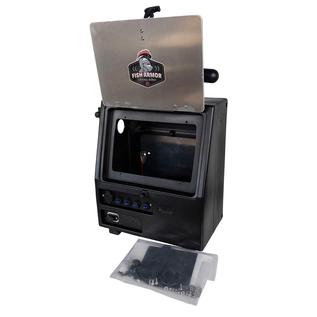 The all-new Fish Armor Pro Extreme. Roto-molded for extreme conditions, providing lightweight, full protection for your forward-facing sonar unit and all components for your Garmin Livescope, Lowrance Active Target or Humminbird Mega Live. Flush mounting screen availability sheds weight and offers maximum protection (available for most screen types). Positive locking marine-grade aluminum door doubles as your sun shield with our tension adjustable friction hinge design. Developed by fishermen for fishermen.